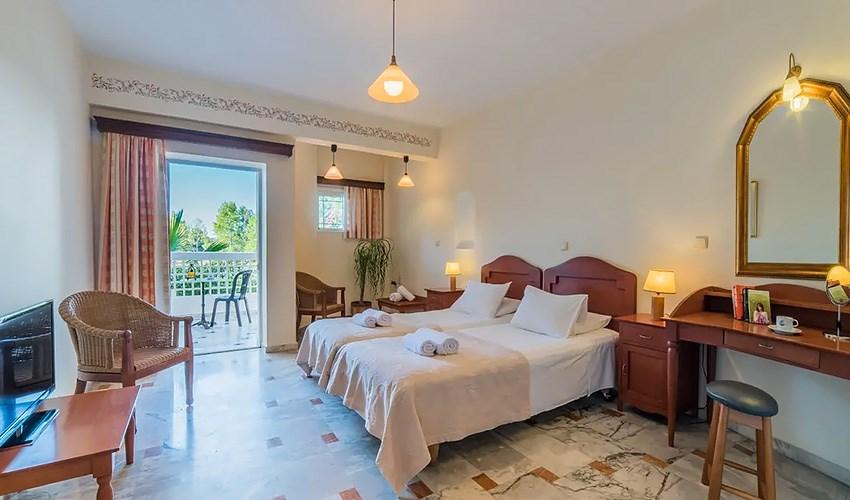 | Tento stylový hotel je umístěný v krásné zahradě mezi živějším letoviskem Laganas a klidnějším Kalamaki. Skládá se z hlavní budovy a tří vedlejších dvoupatrových budov. Od centra letoviska Laganas s bohatým nočním životem je vzdálený jen pár minut chůze. Krásná slunečná pláž, na východě letoviska Laganas známá výskytem želv Caretta-Caretta, je vzdálena 450 m. Přístup k ní je po cestě přes nedaleký soukromý les. Letovisko Kalamaki je vzdáleno 1 km, město Zakynthos 7 km. Hotel doporučujeme všem, kteří hledají příjemnou dovolenou v klidném prostředí s přátelskou atmosférou. |