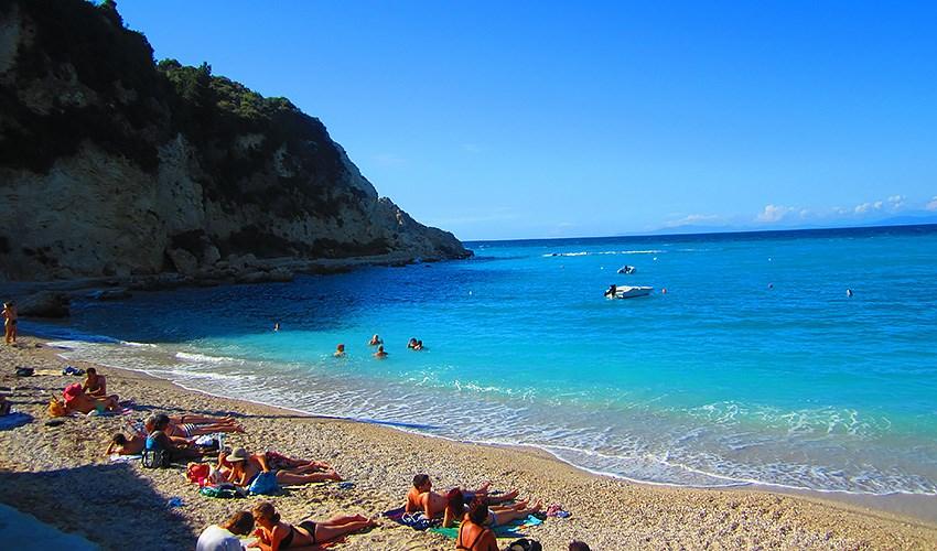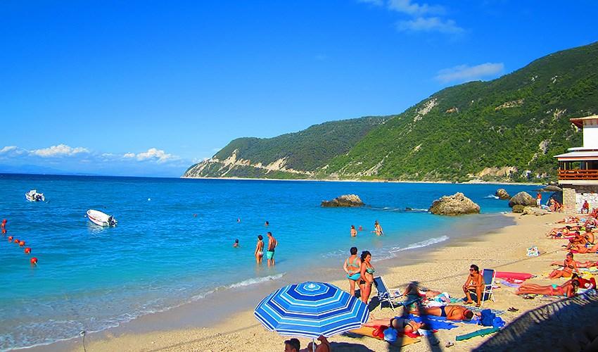 | Oblíbené letovisko Agios Nikitas se nachází na severozápadě ostrova
